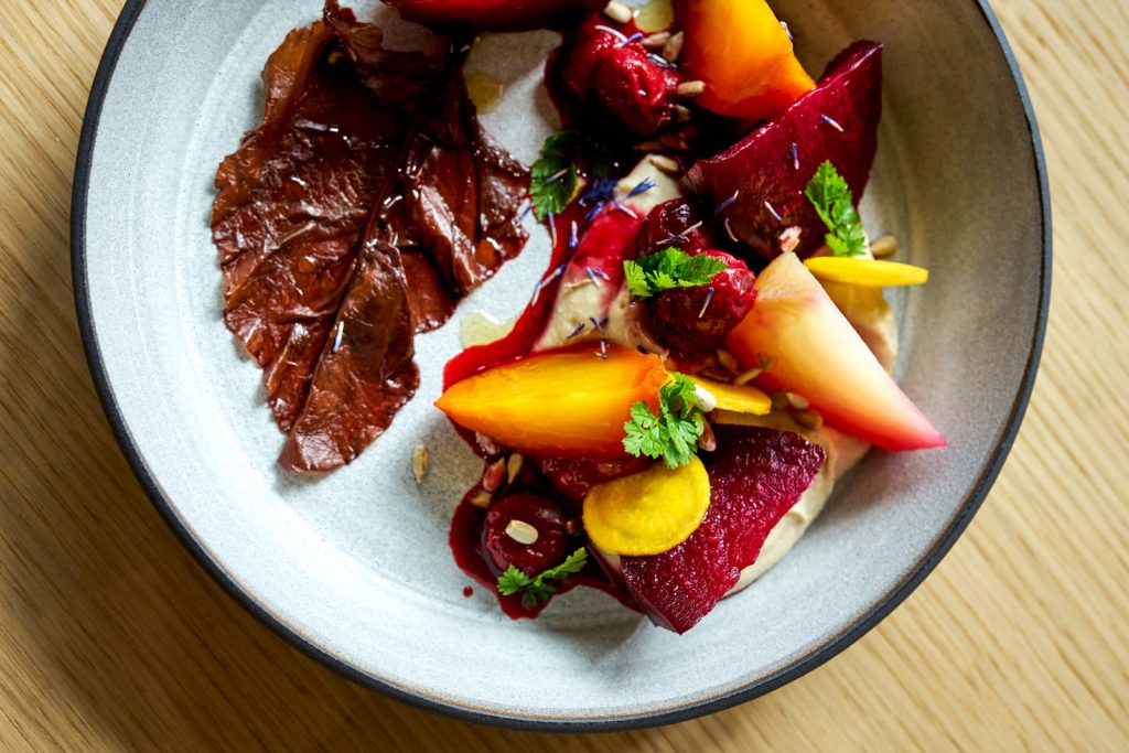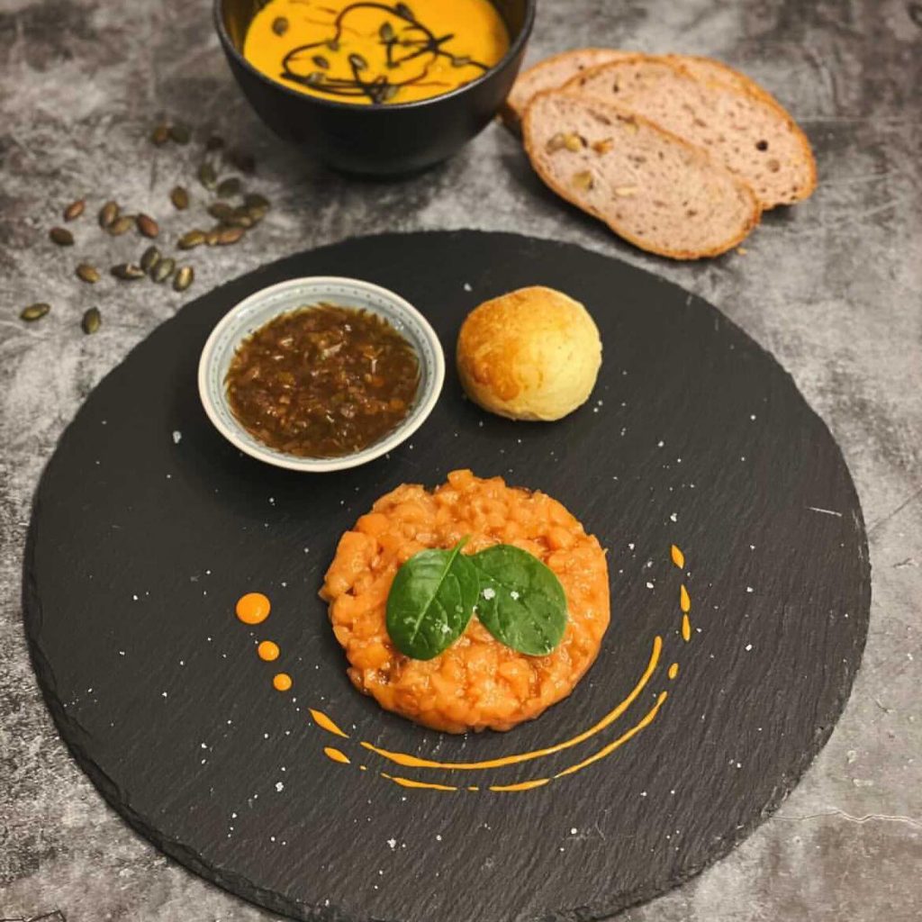 Inhalt für 2 Personen: Je nachdem für wie viel Gänge ihr euch entscheidet, könnt ihr euch auf das vegane Kulinariat Tatar, Rote Bete-Zimt-Schaumsuppe, Dry Aged Louisiana Sellerie, einen Trüffelgang, einen Fischgang (die vegetarische Alternative zum Fisch ist ein pochiertes Bio Ei mit Alblinsen und grüner Soße) sowie Beefsteak (für Vegetarier*innen gibt es Sous-Vide Curry Karotte, Pommes Maxime und Ketchup) sowie einer Eclair-Kreation als krönenden Abschluss freuen.