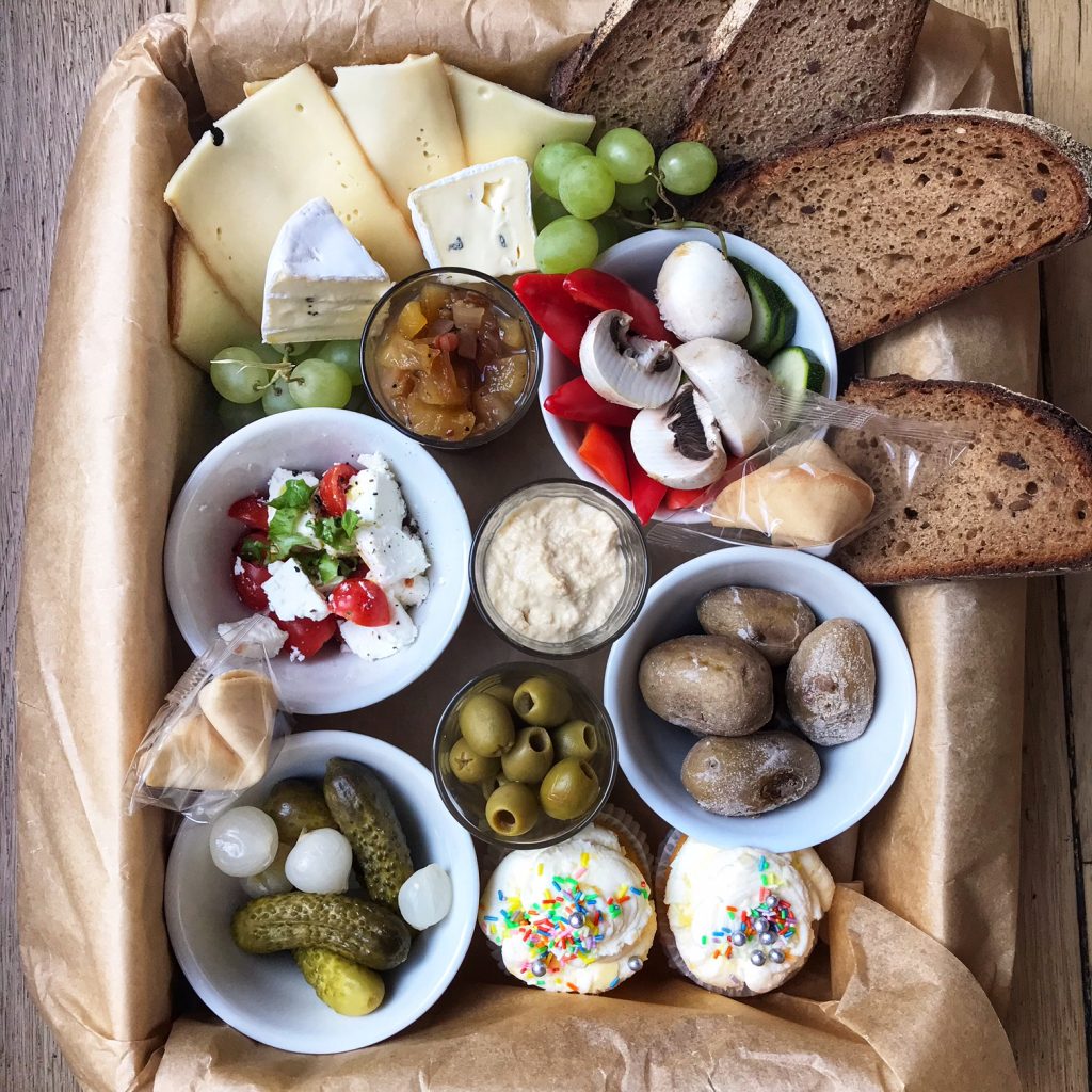 Inhalt für 2 Personen: Spart euch die Schlepperei für den Einkauf, denn die Raclette Box beinhaltet abgesehen von Basics auch raffinierte Sachen. Ihr könnt euch freuen auf Raclettekäse, Blauschimmelkäse, selbst gemachtes Chutney, selbst gemachten Hummus, Bio-Brot, Oliven, verschiedenes frisches Gemüse, Mixed Pickles, Tomaten-Feta-Minz-Salat, Papas arrugadas und zum Nachtisch: 2 Cupcakes und zwei Glückskekse.