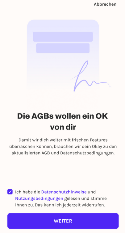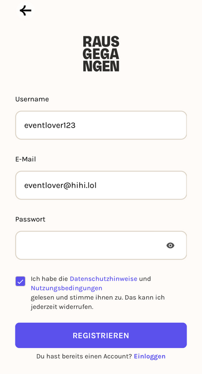 Du bleibst angemeldet in der App (wenn du bereits einen Account hast) - oder erstelltst deinen neuen Account indem du die folgenden Schritte befolgst:
