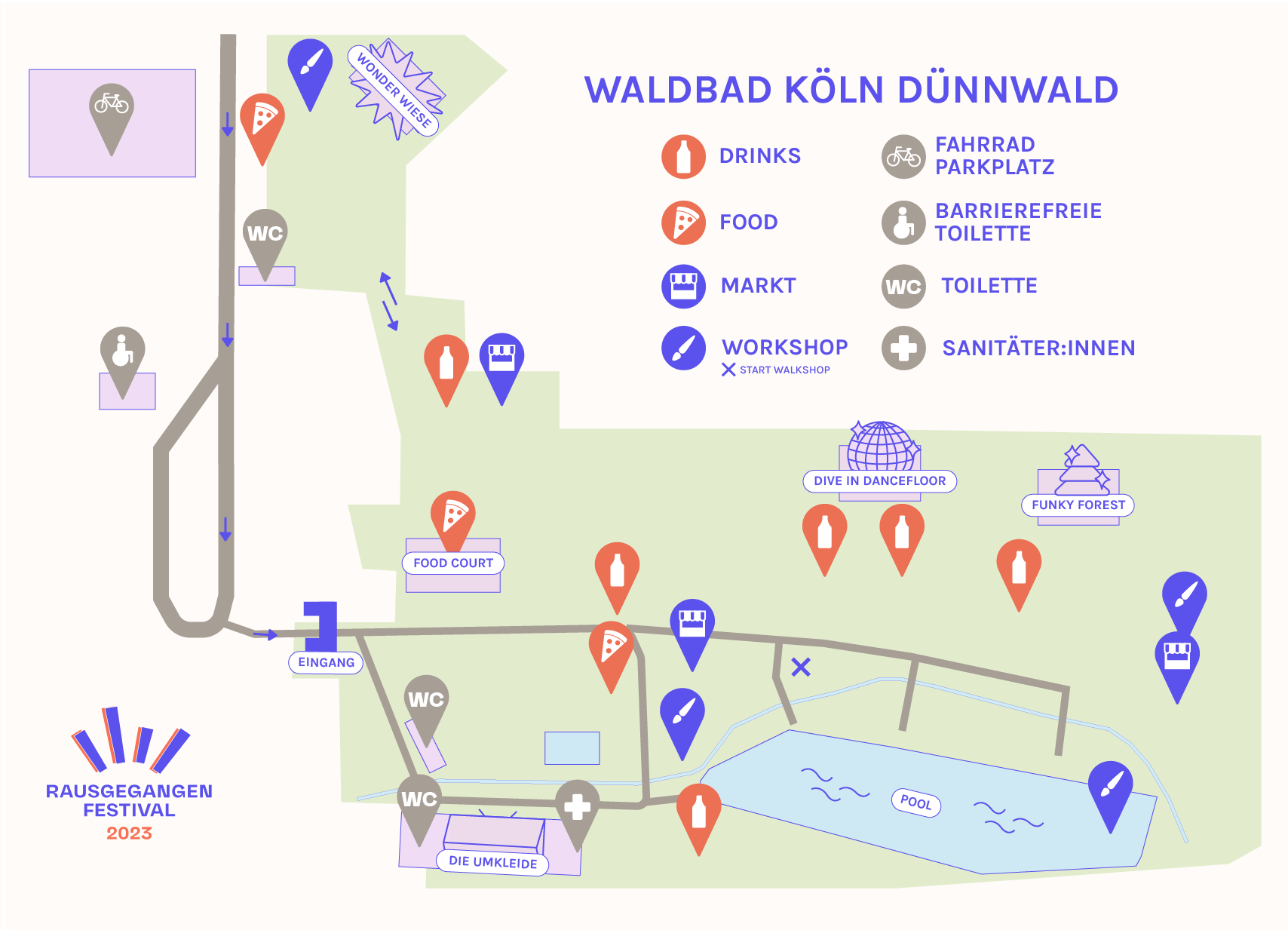 Es gibt viele verschiedene, kleine und große Bühnen, in versteckten Ecken oder mitten im Pinienwald für Musik aber auch alle anderen Genres bieten. ✨ Schau dir hier unseren Geländeplan an. Das Waldbad ist zwar etwas außerhalb des Zentrums, aber trotzdem noch mit der Straßenbahn erreichbar - für uns eine grüne Oase im Stadtgebiet.